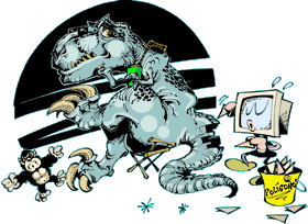 Já faz algum tempo que os computadores são usados no cinema para criar efeitos especiais. O diretor George Lucas foi um dos pioneiros desta arte e até fundou uma companhia especializada em efeitos especiais: a Industrial Light & Magic. Como você acha que foram feitos aqueles bichos gigantescos do Parque dos Dinossauros (Jurassic Park)? Não, não eram bonecos. Pelo menos, não como se fazia antigamente. King Kong foi feito em 1933, e o macaco gigante (o tal Kong) que se apaixona pela mocinha era uma marionete. Quando ele é filmado no topo de um prédio, a cidade que aparece é de miniatura. Mas os "bonecos" de Parque dos Dinossauros eram bem mais sofisticados. Cerca de 50% da produção foi feita com imensos bonecos mecanizados, e o restante foi arte da computação gráfica. Os dinossauros do filme foram montados em computador e depois inseridos na imagem, para participar das cenas com os atores. Primeiro, é feito um modelo do bichão. Depois, estuda-se como ele vai se mover. Existem alguns softwares (programas) que ajudam a fazer com que um desenho se mova em um cenário virtual com três dimensões (altura, largura e profundidade). Mas tudo isso tem que ser programado. Os games também são baseados em computação gráfica. Para montar os homenzinhos que vão lutar, jogar bola ou até correr nos jogos, muitas vezes é preciso pegar o corpo de um atleta de verdade para servir de modelo. Depois, o desafio é imitar os movimentos de seus músculos com um software de animação. Hoje já existem técnicas de captura muito sofisticadas, como a "Motion Capture", que captam com perfeição os movimentos humanos. |