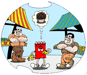 - O quê? Quem quer, quer alguma coisa. - Eu quero um brigadeiro. Mal tinha começado a conversa entre o dono da Barraca Verbal e Tomás Nota, já chegou alguém para interromper. (Sussurros): - Ei, você está sabendo? - perguntou a pessoa que interrompeu. - De quê? Minha filha, quem sabe, sabe de alguma coisa - sussurrou de volta o dono da Barraca Verbal. - Ah, deixa para lá. Apesar de parecer distraído, o que o dono da Barraca Verbal queria mostrar para as pessoas é que muitos verbos precisam de complementos. Por isso, são chamados de verbos transitivos. Quando o verbo pede um complemento que tem preposição ("de alguma coisa"), é chamado de transitivo indireto. Quando o complemento não tem preposição ("alguma coisa"), o verbo é transitivo direto. E assim, os complementos são chamados de objeto direto e objeto indireto. "Eu quero um brigadeiro" Eu = sujeito quero um brigadeiro = predicado quero = verbo transitivo direto um brigadeiro = objeto direto Ah, mas não é só isso. Tomás Nota também descobriu tudo sobre a voz passiva e os adjuntos adverbiais. Sabe como? |