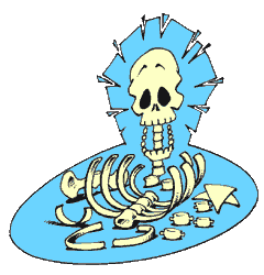 Você já viu uma caveira? Reparou que no lugar do nariz ela tem um buraco? É que a caveira é só osso _ e boa parte do nariz é uma cartilagem... Crânio: é o conjunto de ossos que envolvem e protegem seu miolo mole. O traumatismo craniano ocorre quando uma pancada muito forte quebra alguma parte dessa proteção. Há duas aberturas para encaixar os olhos chamadas órbitas; e também aberturas para os ouvidos e o buraco do nariz. Blá blá blá. Ao crânio está encaixada a mandíbula, que se mexe quando sua caveira mastiga, ri, fala. Credo! A clavícula, osso fácil de quebrar, envolve o pescoço e os ombros. As escápulas (antigamente chamadas de omoplatas) sustentam os ombros. Se fôssemos anjos, as asas cresceriam aí. Os 12 pares de costelas são um grupo especial no batalhão dos ossos. Elas são os seguranças do coração e do pulmão. Para proteger esses órgãos, elas formam a caixa torácica, com a ajuda do esterno, o osso do peito. As costelas são elásticas e se movimentam quando enchemos o pulmão de ar. E estão ligadas à... Coluna vertebral (espinha dorsal): também é flexível. Ainda bem _ se não fosse, como você amarraria o sapato? Como olharia para trás, quando seu melhor amigo está chamando você? A coluna é formada por uma porção de ossinhos chamados vértebras, empilhados um em cima do outro, com a ajuda de articulações e ligamentos. O nome do último ossinho da coluna vertebral é cóccix. Outro conjunto de ossos forma a bacia, nossa "cadeira" natural. Fazem parte dela os ossos do quadril - protetores dos nossos rins, por exemplo. |