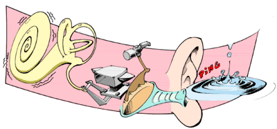 As ondas sonoras entram pela orelha e chegam no canal auditivo. No fim deste canal, fica a membrana do tímpano. Ela chacoalha como uma cortina quando as ondas sonoras passam, e vibra como um tambor. O tímpano, por sua vez, transmite essas ondulações a três ossos bem pequenos que existem em uma parte do ouvido, chamada orelha média. Esses ossinhos têm nomes engraçados: martelo, bigorna e estribo. Primeiro, as vibrações chegam ao martelo. Ele bate na bigorna, que passa sua vibração ao estribo. Martelo, bigorna e estribo são os menores ossos do corpo. Aí começa a orelha interna, formada pela cóclea e pelos canais semicirculares. Um caracol vibrante: a cóclea é um tubinho em forma de caracol! Ela pega as vibrações do estribo e as transforma em impulsos nervosos. Estes são então enviados para o cérebro, que vai distinguir os sons. Os canais semicirculares são responsáveis pelo nosso equilíbrio. Em seu interior há um líquido cujo movimento informa ao cérebro a posição da cabeça, e mudanças súbitas de velocidade. Isso permite ao corpo perceber que está caindo. Percebemos que estamos
